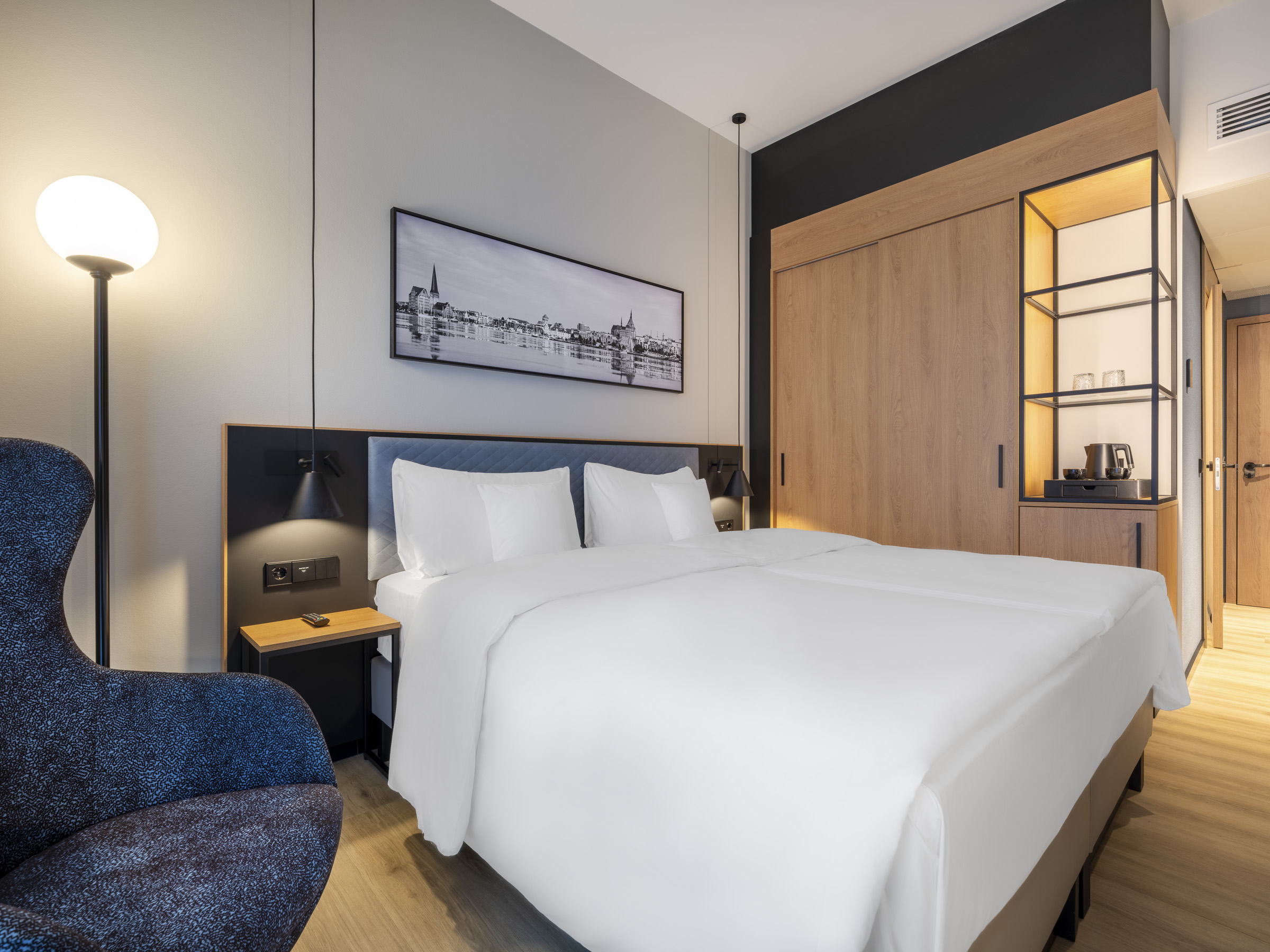 Das Standardzimmer mit Hafenblick verbindet Funktionalität mit Weitblick. Starten Sie den Tag mit einem einzigartigen Blick auf den Rostocker Stadthafen. Klares Design trifft auf Wasserblick – Ideal für alle, die Helligkeit und Aussicht schätzen.