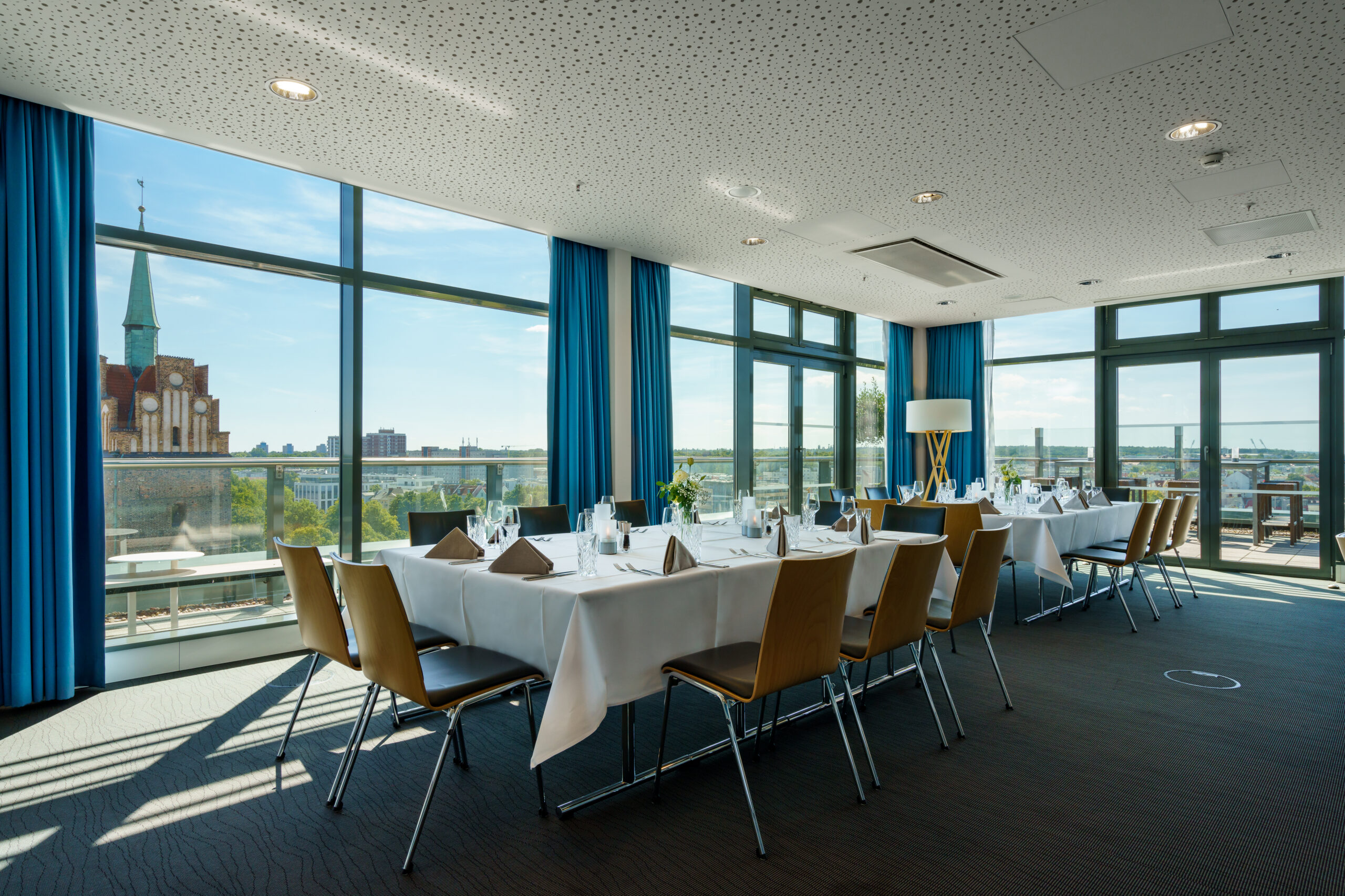 With generous window fronts and a view over the Warnow, Panorama 2 offers a special setting for meetings, workshops or exclusive dinners. The light-flooded room impresses with modern technology, a stylish ambience and plenty of peace and quiet - ideal for focused meetings above the rooftops of the city.