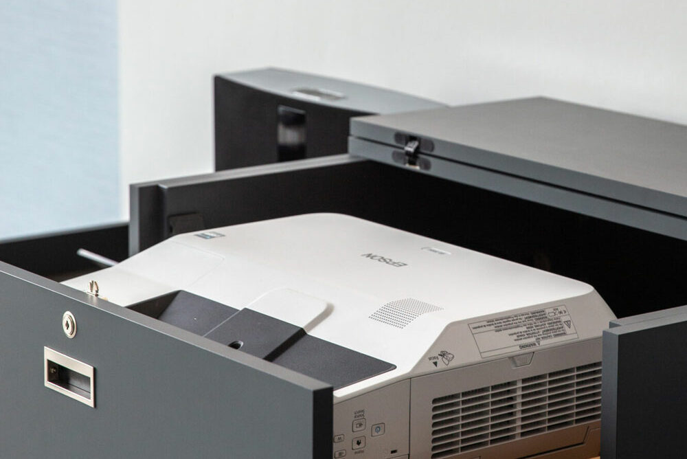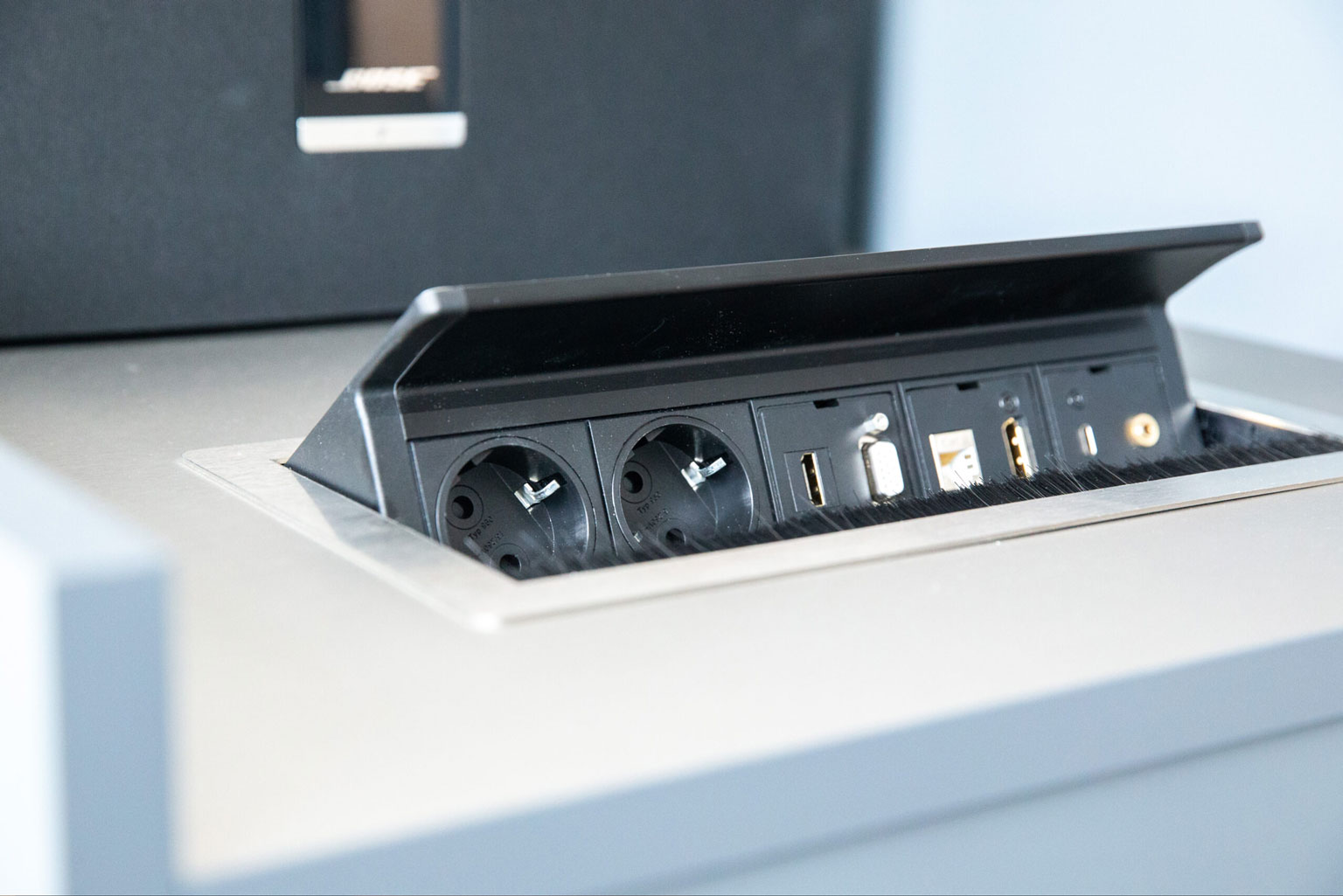 Bose Sound Systeme und eine magische Schublade mit allem, was Sie brauchen (Adapter, Presenter, Lautsprecher, Presenter…) sind in jedem Veranstaltungsraum vorhanden.