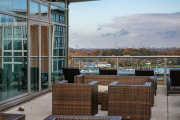 Genießen Sie nach einem intensiven Cardiotraining den Panoramablick auf den Stadthafen von unserer Sonnenterrasse und die frische Luft auf Ihrer Haut.